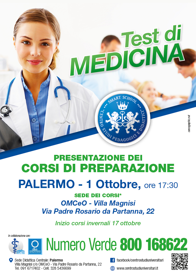Formazione Test di Medicina - Presentazione dei corsi di preparazione martedì 29 settembre 2015 Facebook Twitter [Apri l'allegato] 1 Ottobre ore 17.30 - Villa Magnisi Numero verde 800 168622 Inizio corsi invernali 17 ottobre